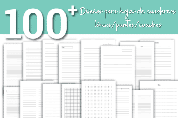 Contiene diseños para hojas de cuadernos en líneas puntos y cuadros, disponibles en formato jpg, png, pdf, ai y svg